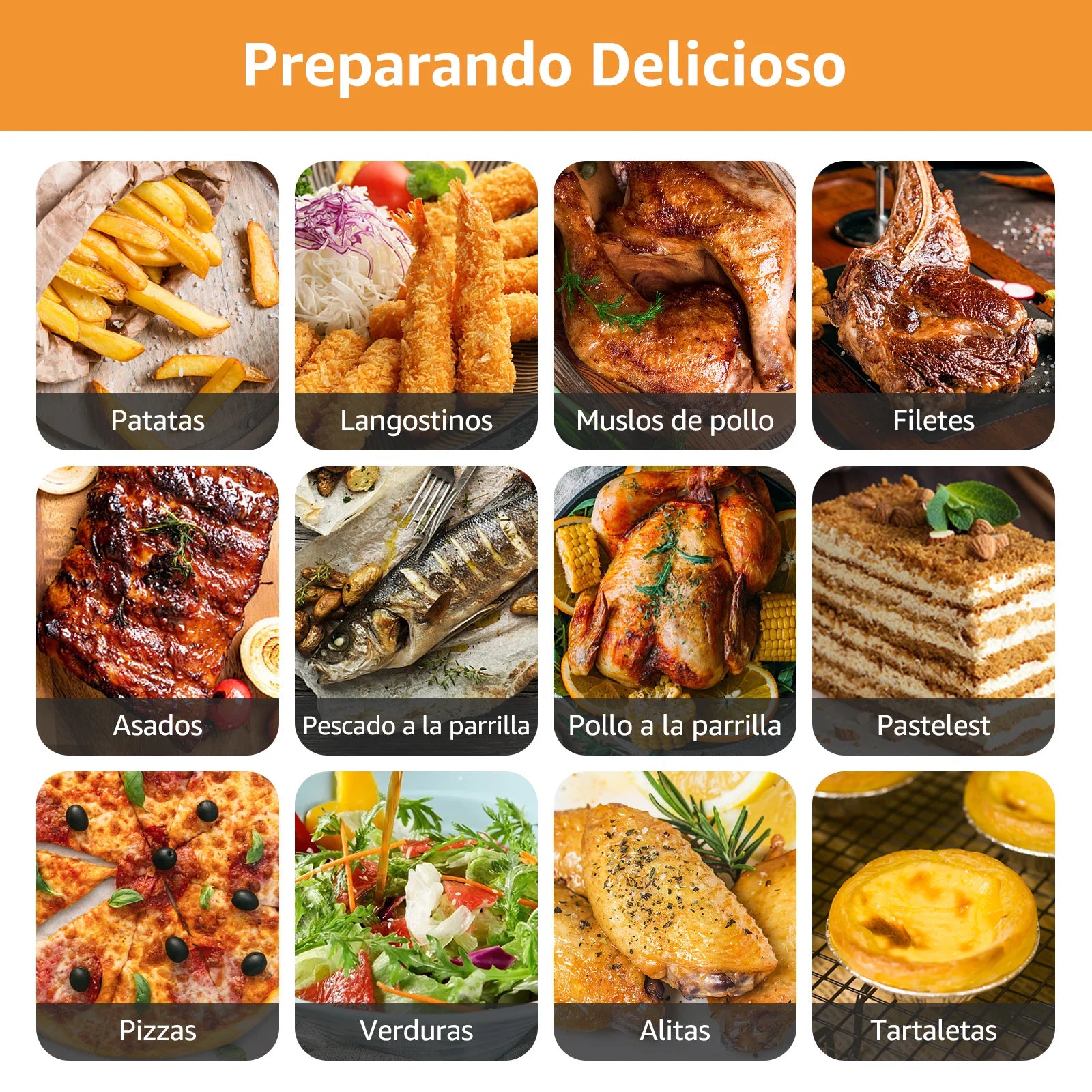 Usos recomendados para la freidora de aire : hornear, descongelar, freír, asar, asar a la parrilla, recalentar.