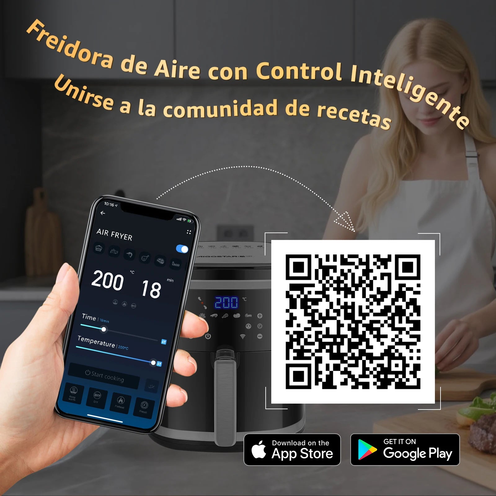 Control inteligente por wifi; cocción con circulación de aire caliente de 360º; temporizador; termostato; revestimiento antiadherente; recipiente extraíble; capacidad de 7 l; panel de control táctil LED; sistema de refrigeración de alta eficiencia.
