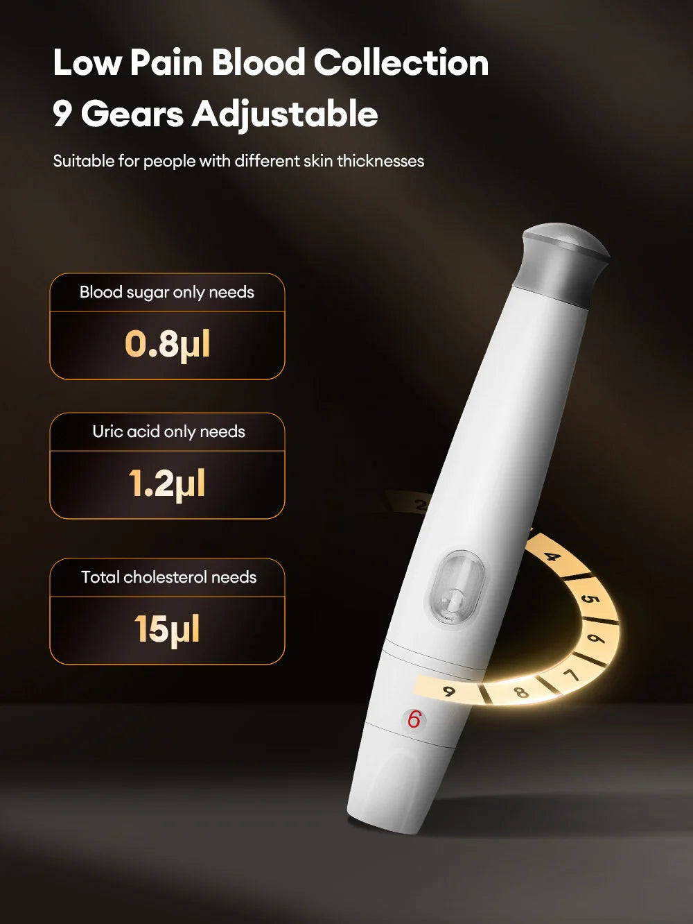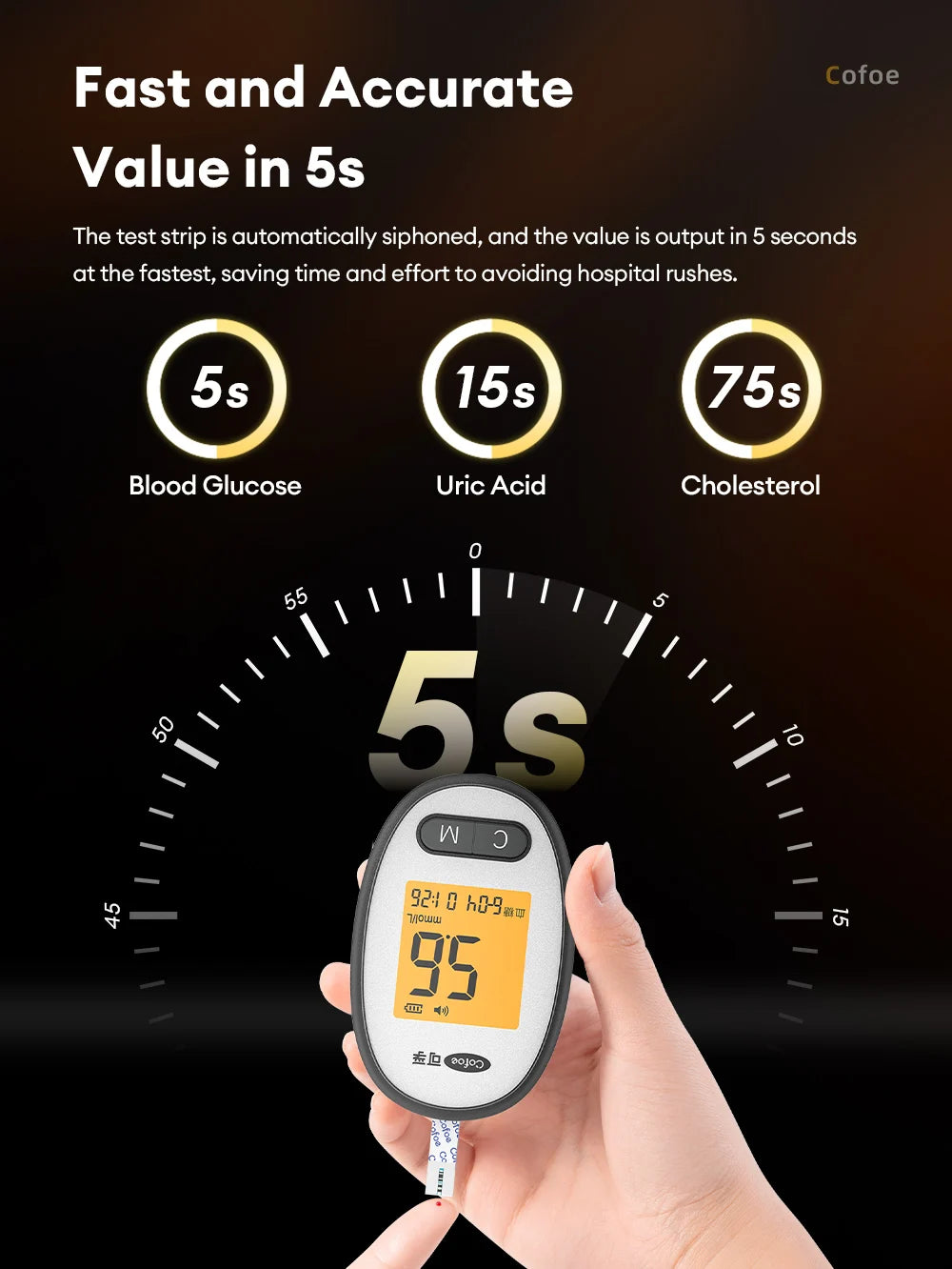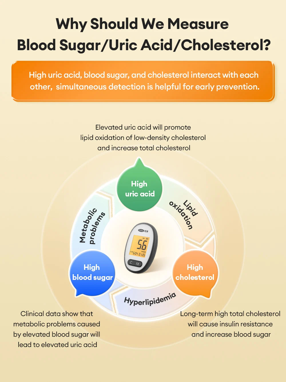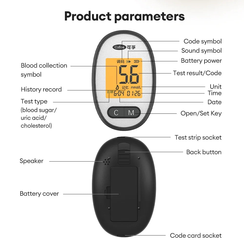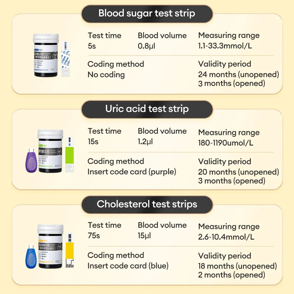 Cuida tu salud metabólica de forma sencilla con el medidor 3 en 1 Cofoe. En un solo dispositivo podrás controlar glucosa, ácido úrico y colesterol con precisión de grado médico, ideal para personas con diabetes, hiperuricemia, colesterol alto o simplemente preocupadas por su bienestar. Cada parámetro se mide en pocos segundos (5s glucosa, 15s ácido úrico, 75s colesterol) con una pequeña gota de sangre y el equipo guarda hasta 600 resultados por tipo de prueba, para seguir tu evolución cómodamente. Su uso es muy fácil: glucosa sin código y ácido úrico/colesterol con tarjeta de código de color. Fabricado en material PVC de protección ambiental y alimentado por 2 pilas AAA (no incluidas), es compacto, ligero y perfecto para usar en casa o llevar de viaje. Un auténtico “todo en uno” para tener tus valores clave bajo control día a día.