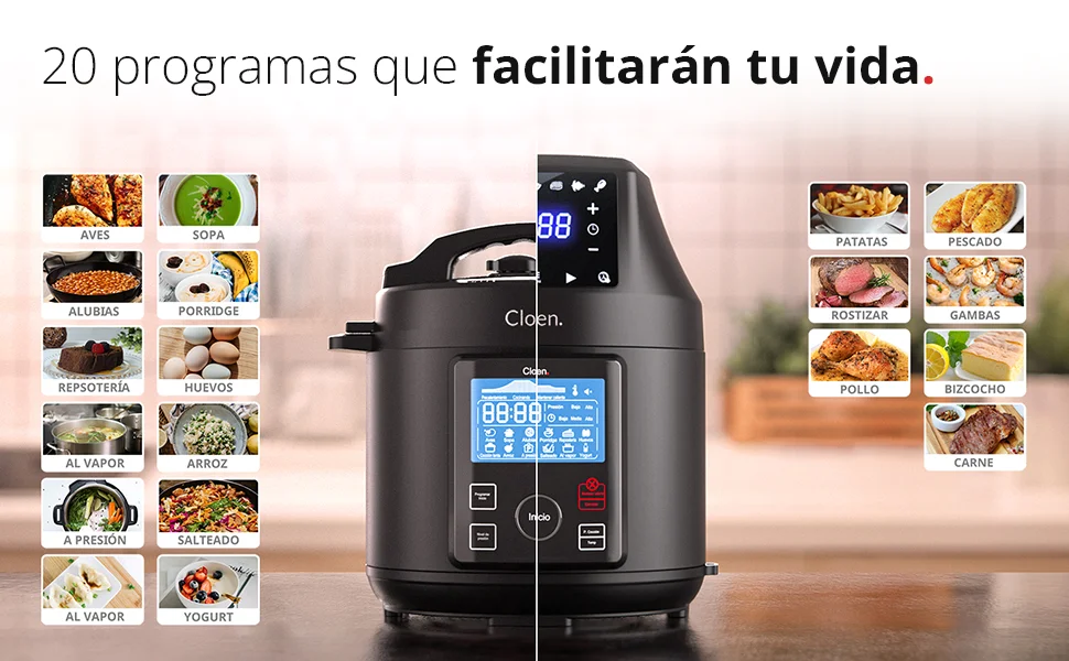 El Sistema Dual Foodie Pot Cloen es un robot de cocina 2 en 1 que combina una olla a presión programable y una freidora de aire caliente simplemente cambiando la tapa. ¡Magia culinaria en versión compacta! 🍲🍟Modo olla programable (1000W)