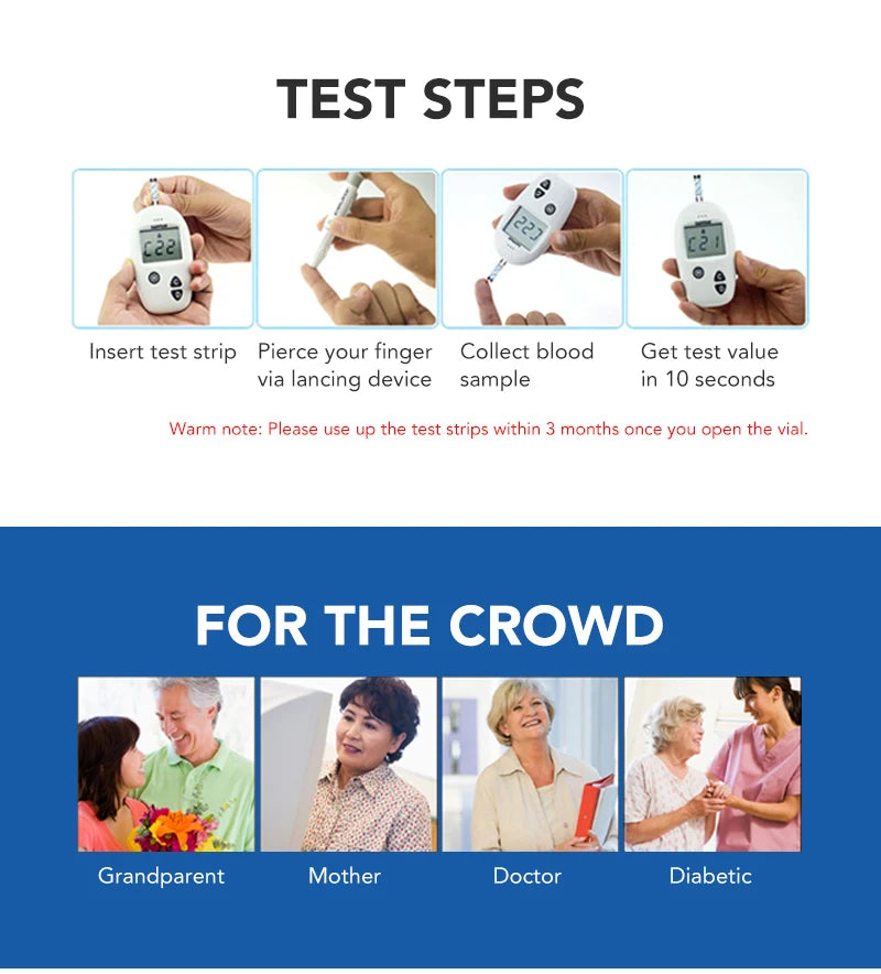 Solo necesitas una gota muy pequeña de sangre (0,6 μl) y en unos 10 segundos tendrás el resultado en pantalla. El glucómetro guarda hasta 200 mediciones en memoria, ideal para revisar tu evolución o comentar los datos con tu médico.